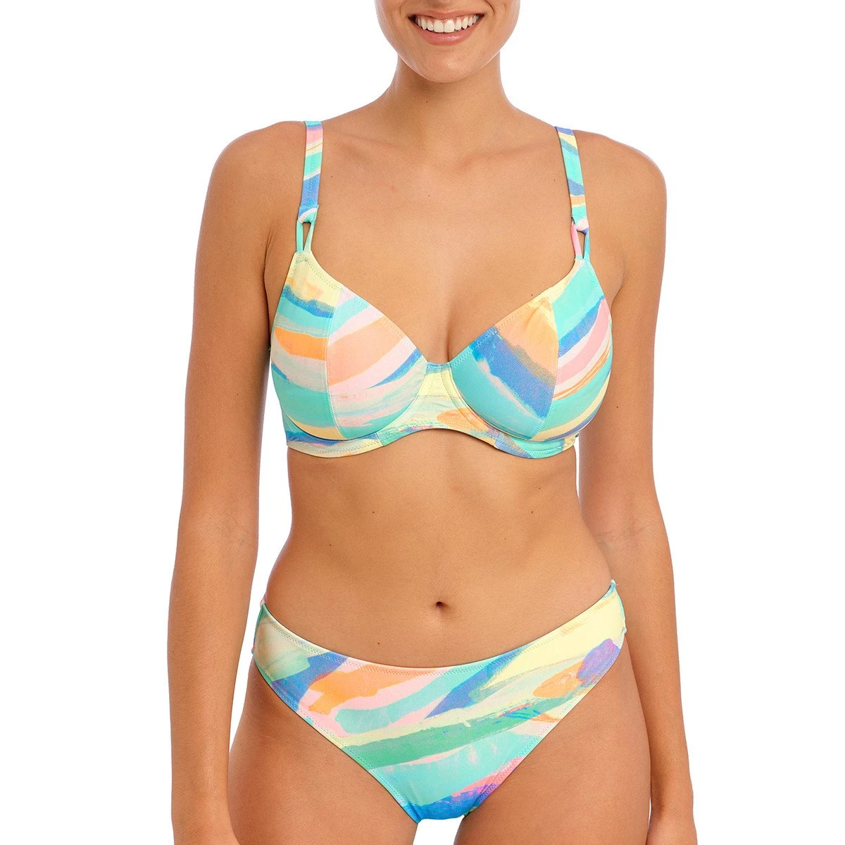 Le bas de maillot de bain Summer Reef Aqua de la marque Freya Swim est un choix élégant et coloré pour les journées ensoleillées à la plage ou à la piscine. Conçu pour offrir un style tendance, ce bas de maillot de bain allie confort et esthétique avec brio. Doté d’une coupe classique confortable, ce bas de maillot de bain mettra en valeur votre silhouette de manière subtile et féminine. L’imprimé aquarelle pastel de ce bas de maillot de bain est un véritable enchantement visuel. Les teintes bleu-vert clairs, rose et bleu lavande se mêlent harmonieusement pour créer un motif délicat et rafraîchissant, évoquant les nuances douces d’un paysage aquatique.
