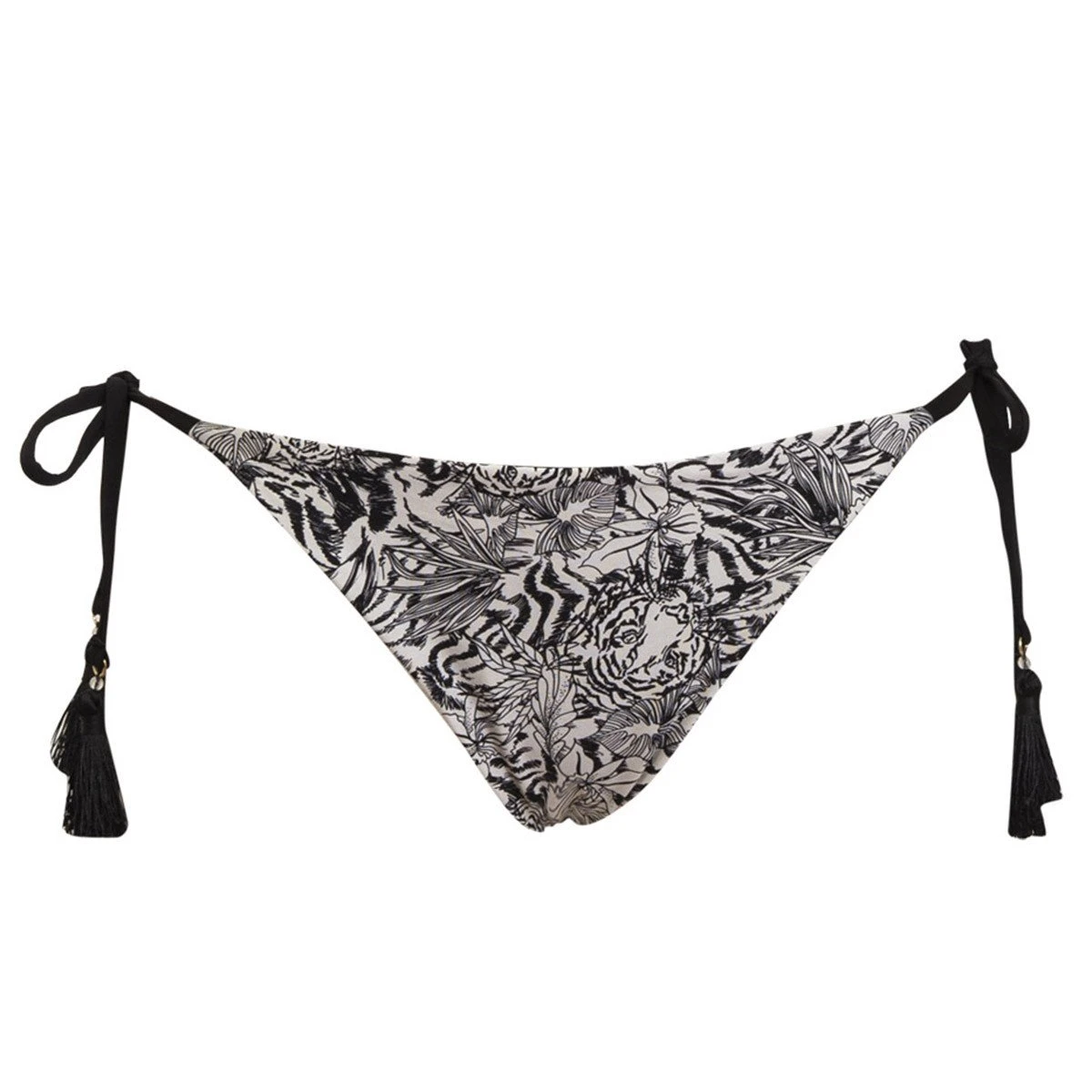 Ce superbe bas de maillot de bain présente un imprimé jungle monochrome noir et blanc audacieux qui ne manquera pas de faire tourner les têtes. Sa forme brésilienne offre une échancrure qui saura révéler vos formes tout en délicatesse. Les attaches latérales à pompons, quant à elles, permettent un parfait ajustement à votre silhouette.