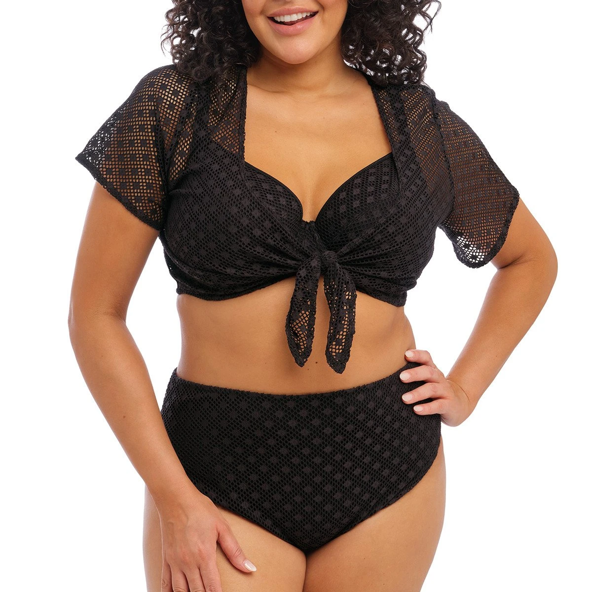 Le top de plage Bazaruto noir d’Elomi Swim nous charme par son superbe tissu au look crochet ! Ce bolero de plage se noue à l’avant et présente des manches courtes amples. Il est conçu dans un tissu doux et souple très agréable à porter. A enfiler par dessus votre haut de maillot préféré pour un style très féminin !