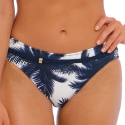 Le bas de maillot Carmelita Avenue french navy imaginé par Fantasie Swim nous transporte directement dans les allées de Beverly Hills ! On aime la coupe classique et confortable de cette culotte de bain mi couvrante et on adore la ceinture contrastante décorée d’un anneau doré sur l’avant. L’imprimé ombres de feuilles de palmier de couleur marine sur fond blanc est chic et tendance.