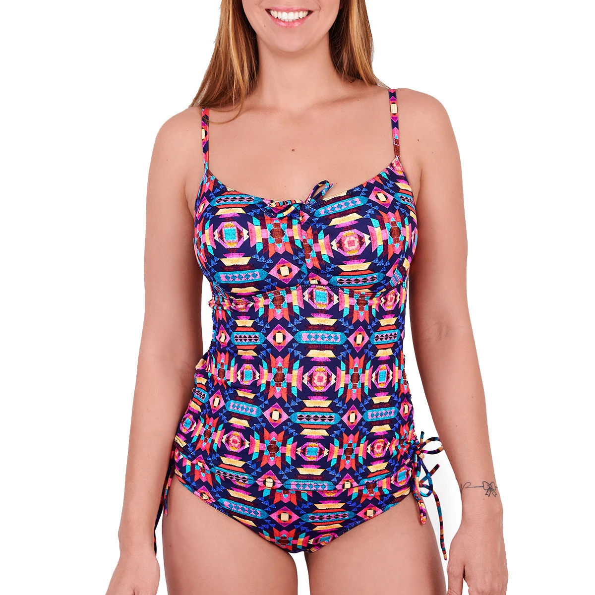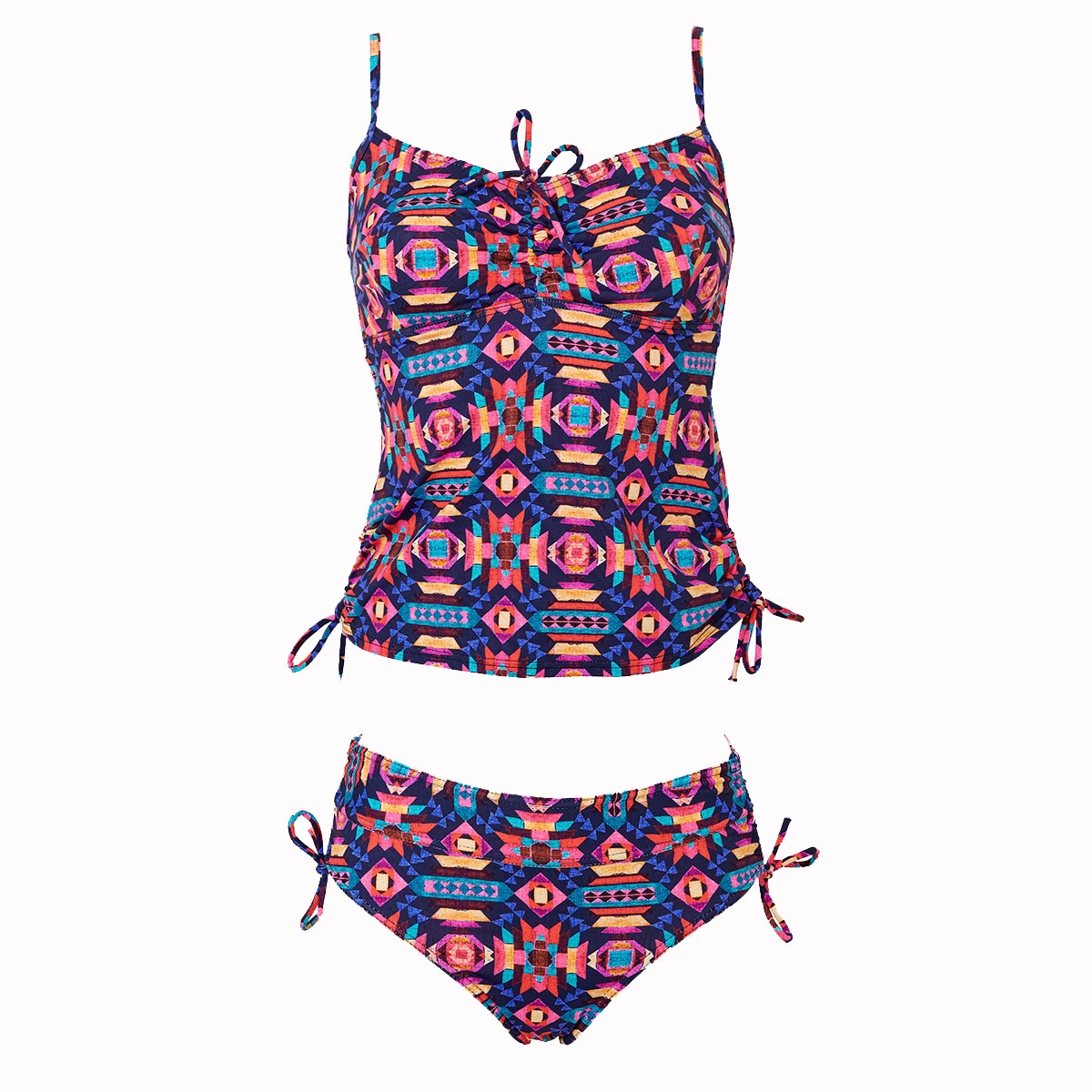 L’ensemble maillot 2 pièces Sangria de Nana Sun nous séduit par son superbe imprimé coloré ! Le haut tankini sans armatures possède des liens à l’entre-seins qui permettent de régler le décolleté. Sa coupe permet de dissimuler astucieusement votre ventre en réglant plus ou moins la hauteur grâce à ses nouettes sur les côtés; nouettes que l’on retrouve également sur la culotte de bain !