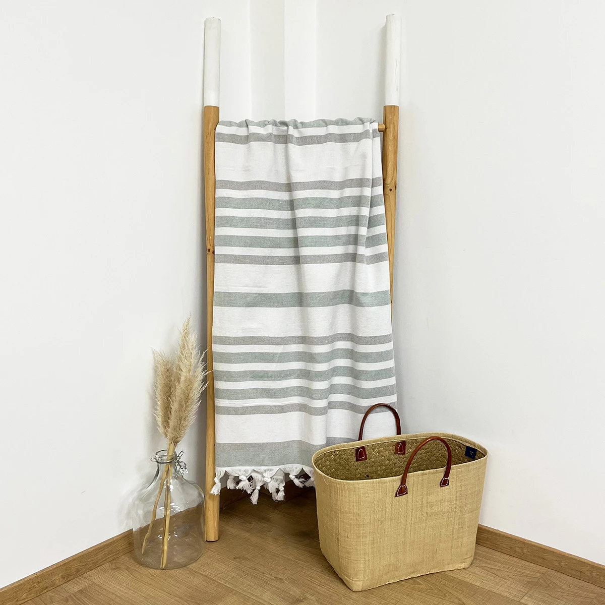 La Fouta Latigo grand format doublée éponge en 140 x 180 cm couleur Desert du Comptoir de la Plage se distingue de la Fouta plate traditionnelle et devient l’accessoire incontournable de votre été. A rayures grises et vertes avec de jolies franges elle est idéale pour la plage ou le bord de la piscine. Son grammage élevé de 340gm² offre une grande capacité d’absorption et permet un séchage rapide.