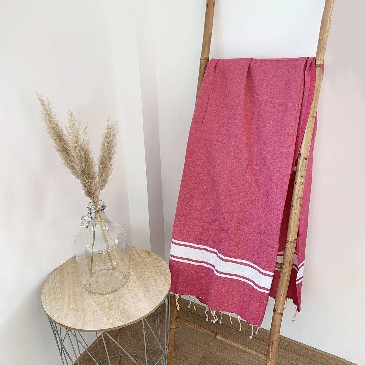 Fouta XL Traditionnelle En Coton 2x2m Unie à 3 Rayures Kozo Fuchsia
