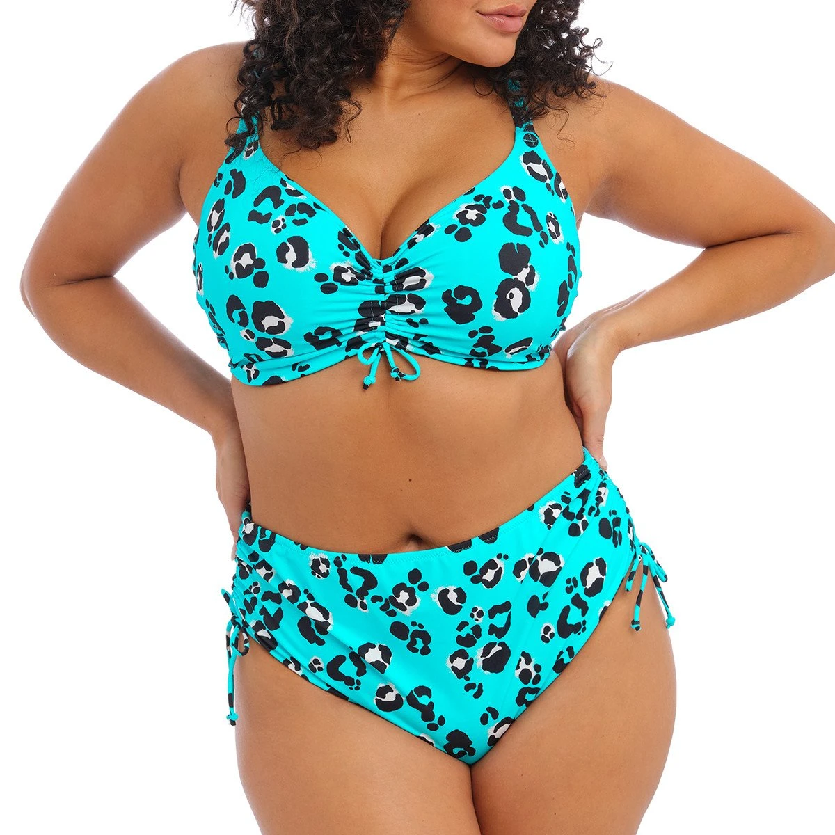 Le haut de maillot de bain Kotiya lagoon d’Elomi Swim est très astucieux grâce à sa possibilité d’ajustement au niveau de l’entre-seins qui permet d’obtenir un décolleté droit ou en coeur. Ce soutien-gorge de bain grande taille à armatures cachées possède un imprimé léopard sur fond bleu turquoise ultra tendance !