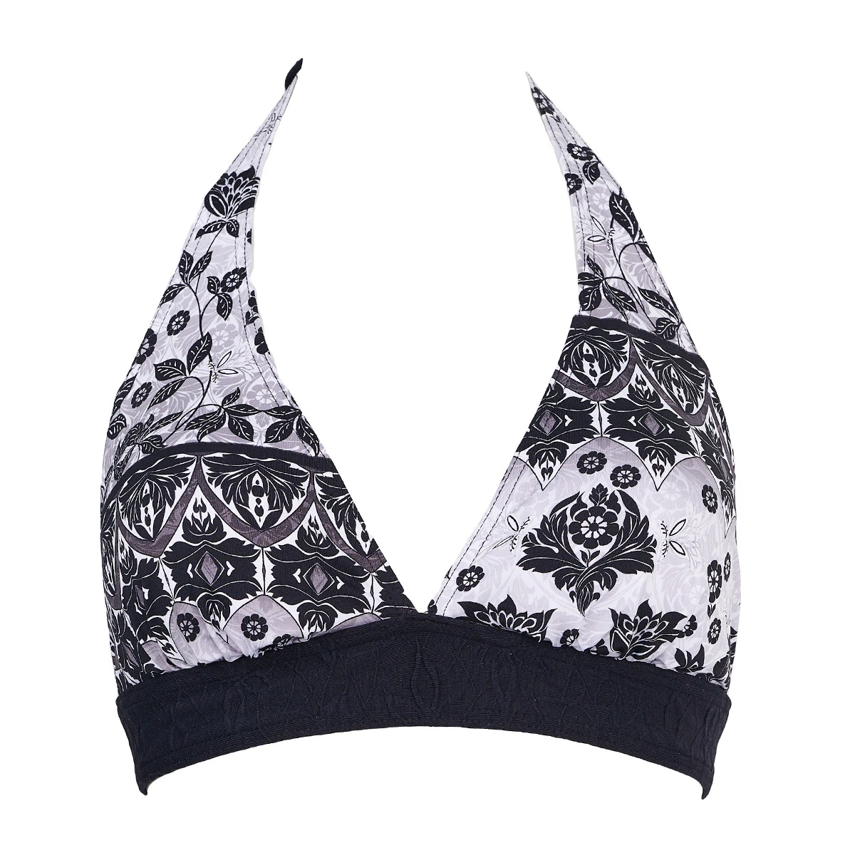 Le haut de maillot foulard sans armatures Dahlia de Sun Playa nous charme par son tissu végétal contrasté de noir sur blanc ultra tendance ! Ce bikini tour de cou possède un décolleté ultra plongeant au rembourrage amovible qui apporte un joli galbe à la poitrine. La bande sous poitrine noire aux motifs subtilement fleuris apporte une finition parfaite au maillot.