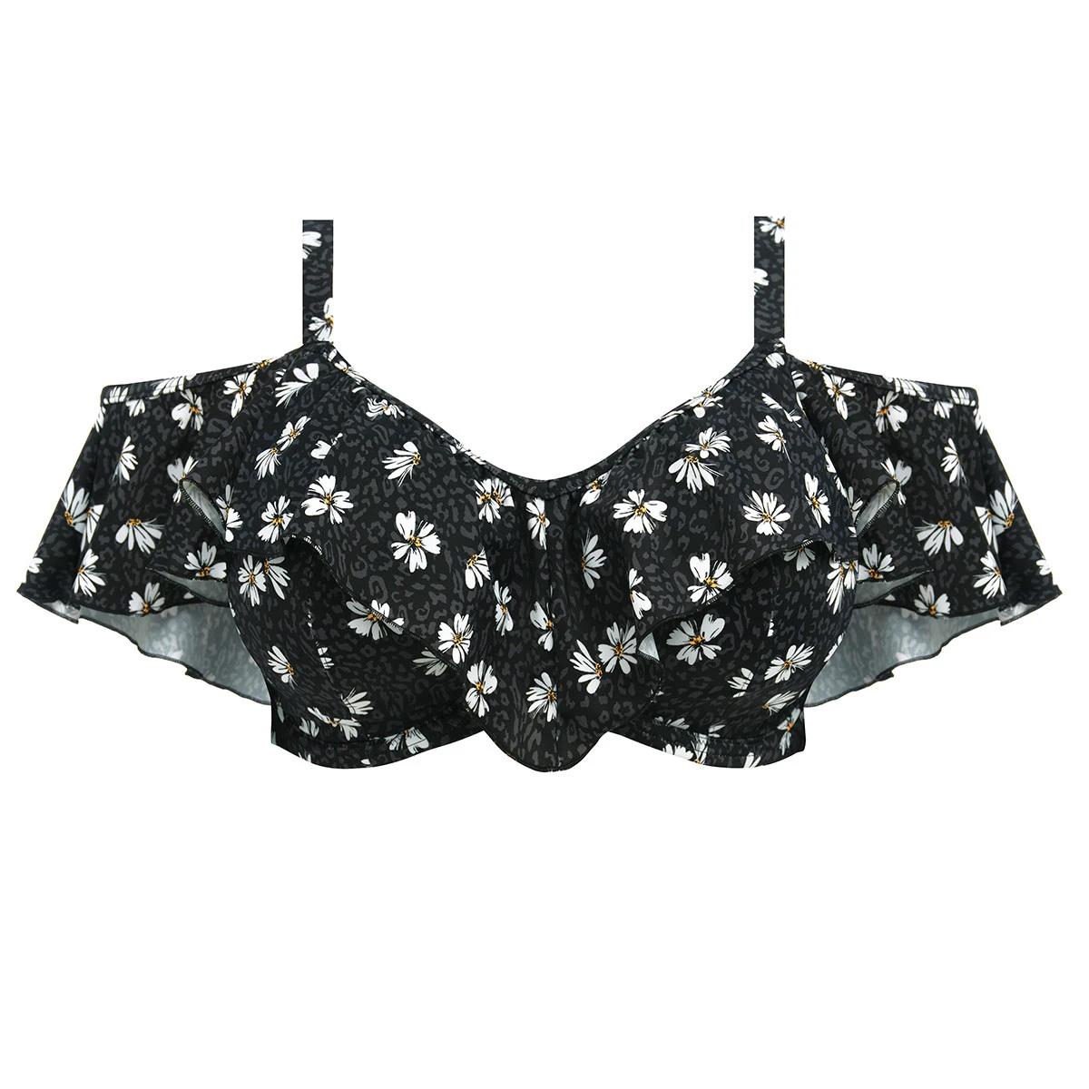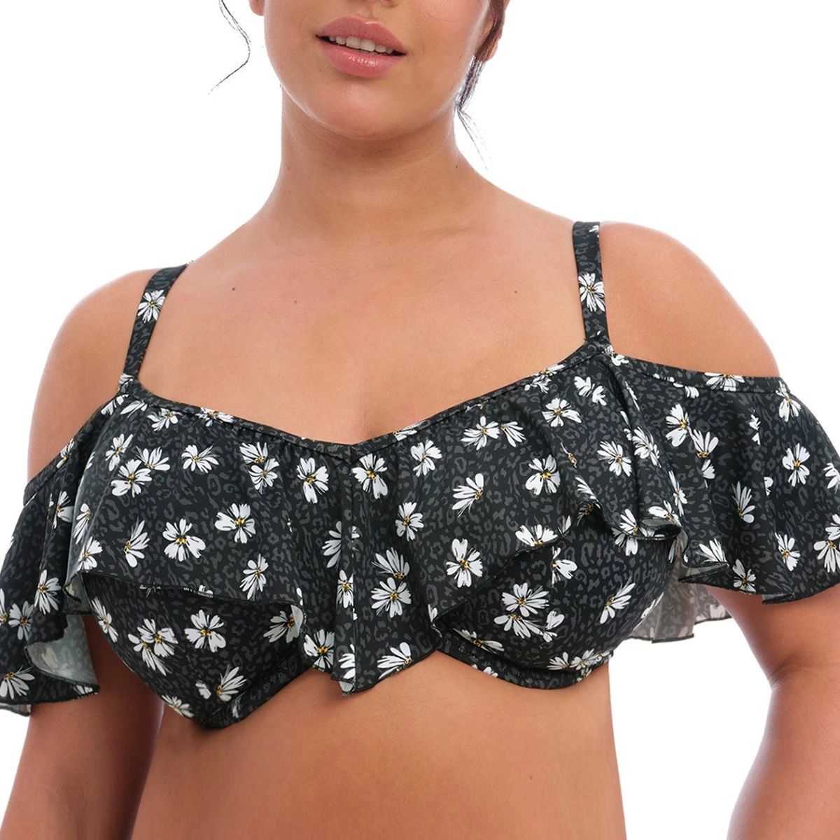 Le haut de maillot de bain grande taille Plain Sailing black daisy d’Elomi Swim nous charme par son volant original et très féminin qui peut être porté sur ou sous les épaules pour varier le décolleté. On adore le motif léopard gris foncé qui ajoute subtilement de la profondeur au fond noir ainsi que les pâquerettes blanches qui réveillent l’imprimé.