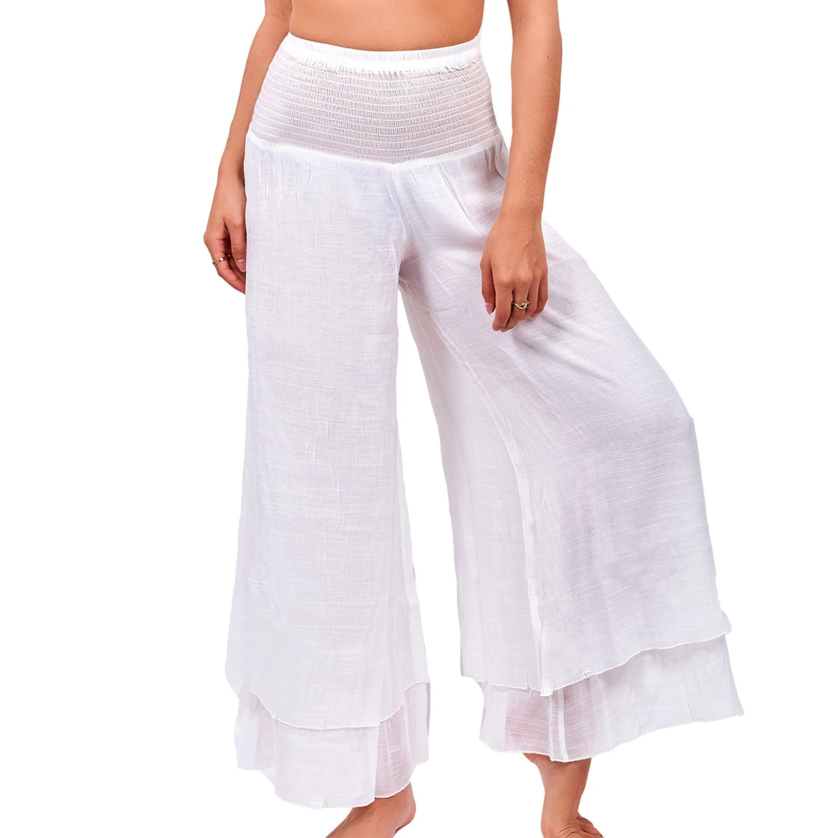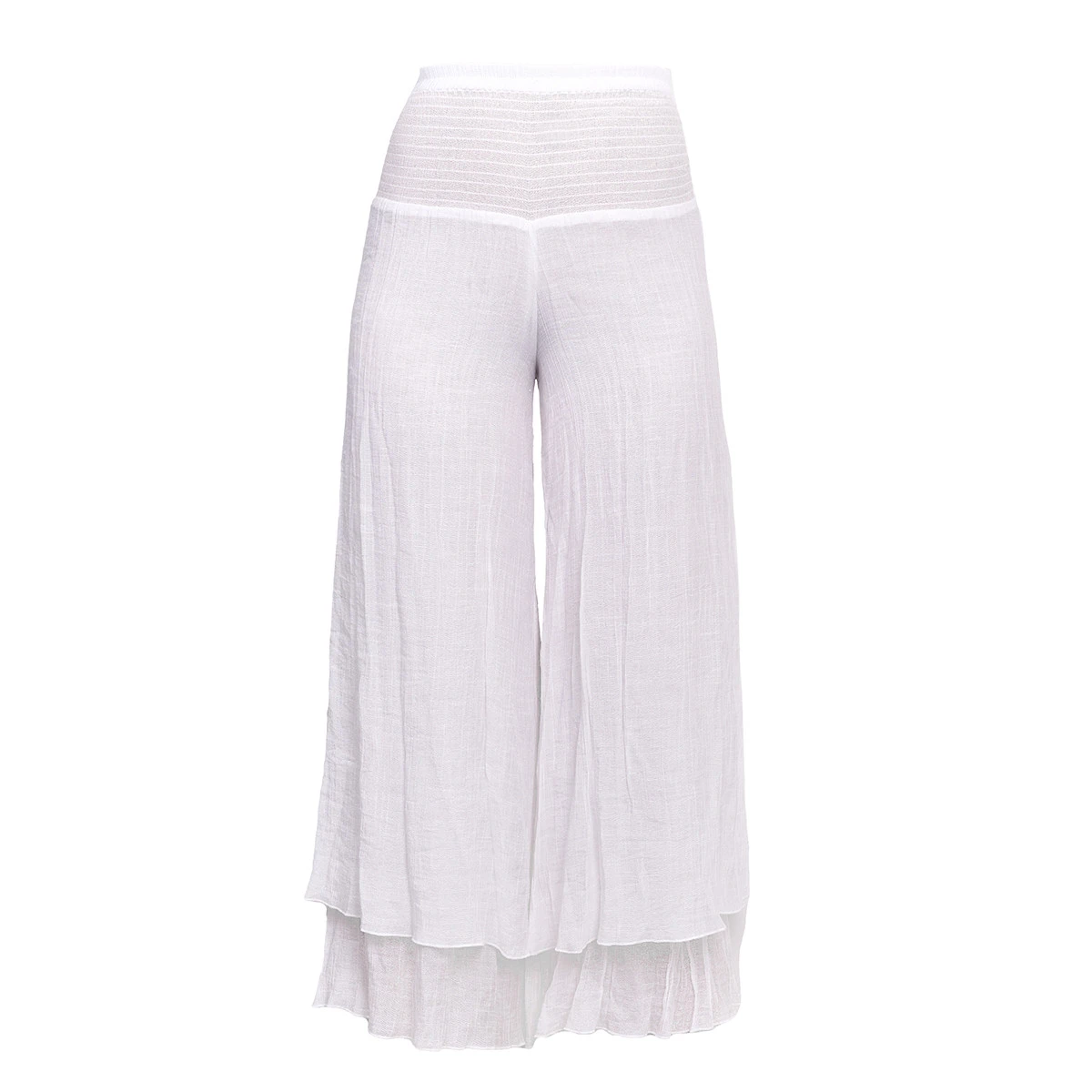 Sublimez votre look de plage avec ce pantalon ivoire de la marque Sun Playa. On adore sa coupe qui se porte taille haute ou taille basse grâce à sa ceinture élastique large qui épousera votre taille avec confort. Coup de coeur pour son tissu doublé fluide et léger qui se termine en bas des jambes tel des pétales de roses. Légèrement irisé et transparent il sera parfait sur votre maillot.