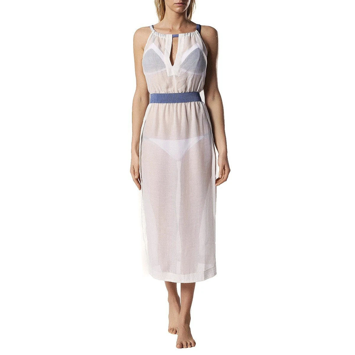 La robe longue de plage Deas écru créée par Diesel nous séduit par son look bohème chic ultra tendance. Coup de coeur pour le dos plongeant et l’originalité du col. On apprécie la ceinture élastiquée qui marque bien la taille et valorise la silhouette. La semi-transparence de la maille apporte beaucoup de légèreté à ce modèle très agréable à porter.